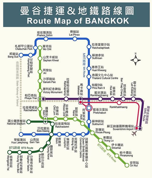 另外给大家介绍一下,以上是曼谷主交通的路线图哦。紫色线的是机场快线铁路(City Line);浅绿色的素坤逸线和深绿色的隆线是轻轨(BTS);蓝色的是地铁(MRT)。根据提示,买你想去的站的票哦!