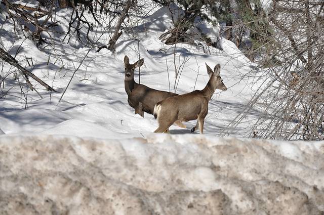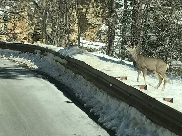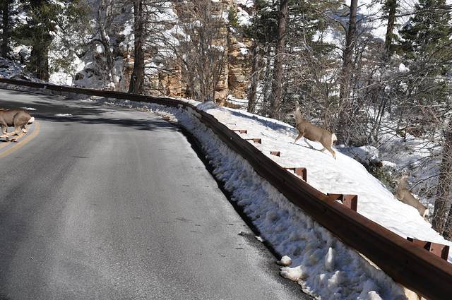等我们回过神继续前行时,发现身后已经排了长长的一串车队,很多人被我们的车挡住,根本没机会拍到横穿公路的鹿群。我们能在咫尺之间和野生动物亲密接触而大饱眼福,大家感慨运气真不错,时间再早点儿或再晚点儿都不行,同时也亲身体会到人类修建公路对野生动物活动造成的影响。