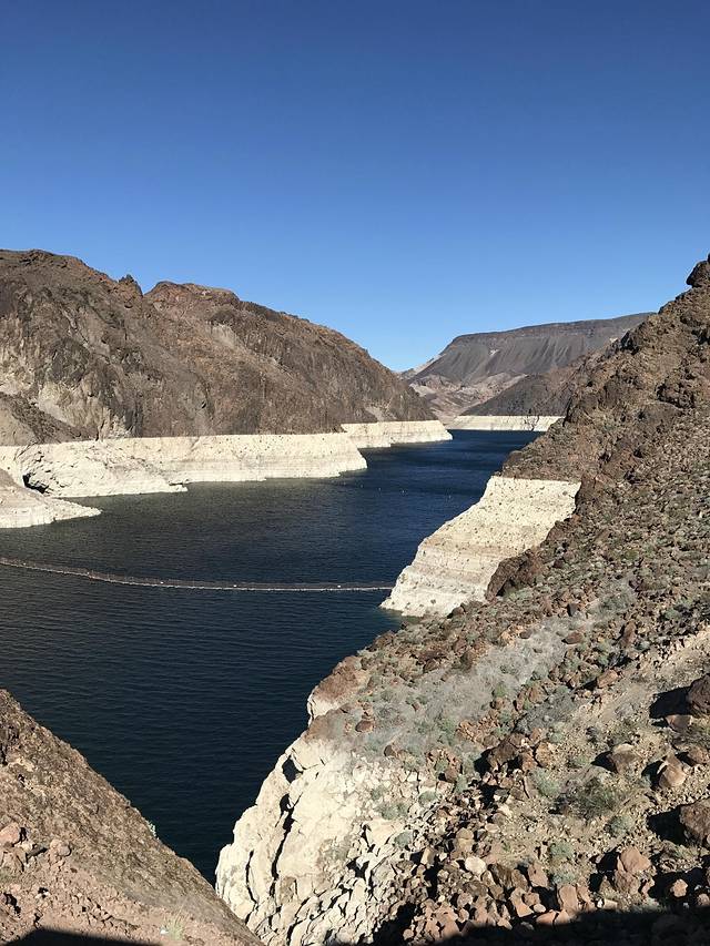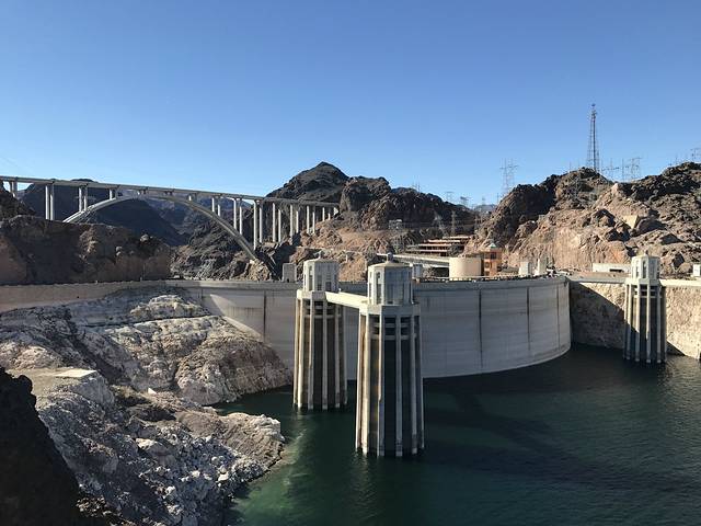 胡佛水坝离拉斯只有不到1小时的车程。快到水坝时,先看到碧波万顷的米德湖,是因胡佛水坝拦住科罗拉多河而形成的堰塞湖。