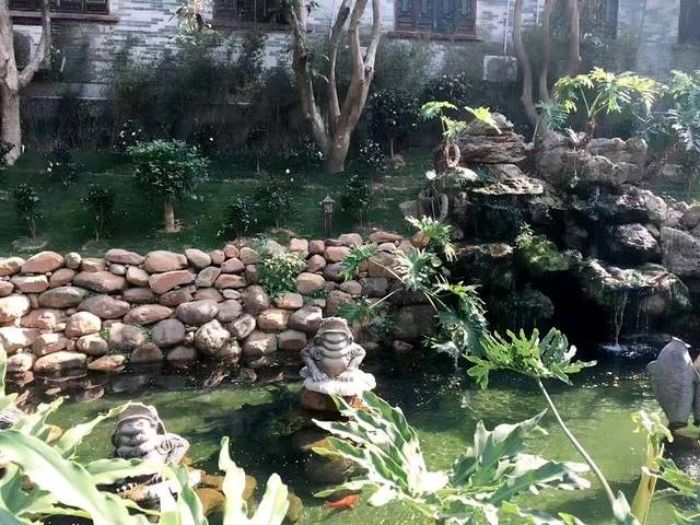 一楼的鱼池有鱼和石头青蛙,我和儿子一起买扔硬币给石头青蛙。摆档卖的硬币十个10元。