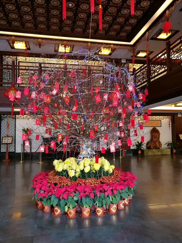 大年初一早餐在酒店二楼就餐,每间房有两张早餐票,凭票进餐厅,小孩不需要票。早餐有豆浆,灵芝茶,茶,五谷粥,白粥,油条,炸菜,炒粉,捞粉,油麦菜,芹菜,小馒头,鸡蛋,玉米。用餐时刚好碰到两只舞狮进来餐厅祝贺,我抱着儿子让他把利是放进舞狮的口里,第一次,儿子好高兴。