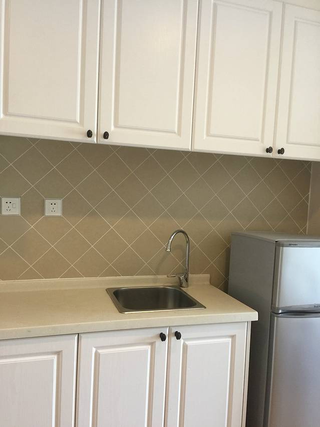 洗漱间外配有水龙头和电冰箱,方便清理水果