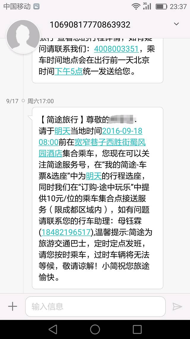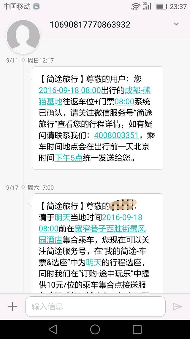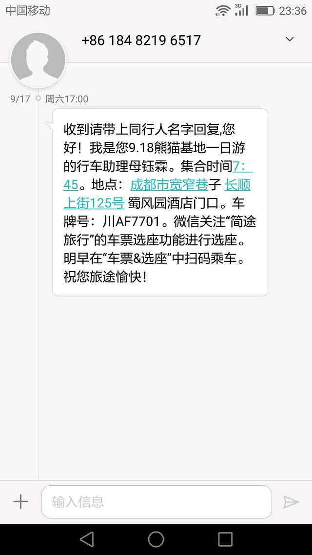 我们在旅游的过程中,提前去熊猫基地的一天就收到了选座短信