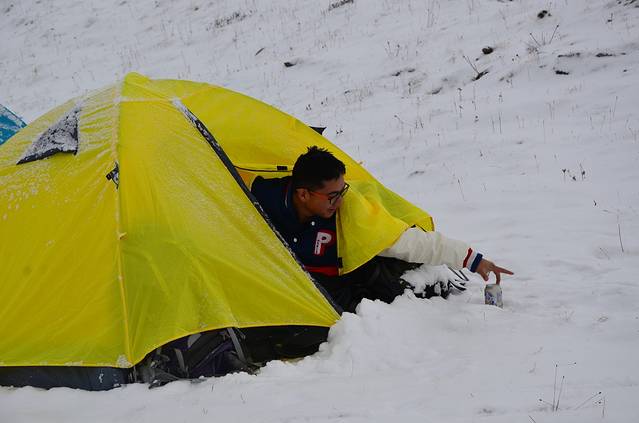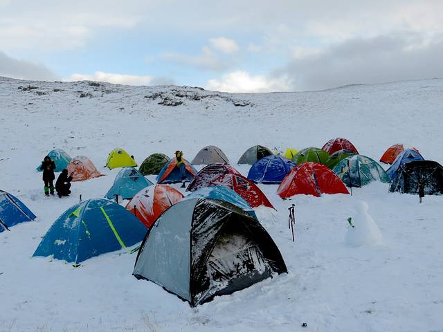 到达营地,甩下背包扎营时,纷纷扬扬的大雪突然而至。