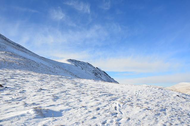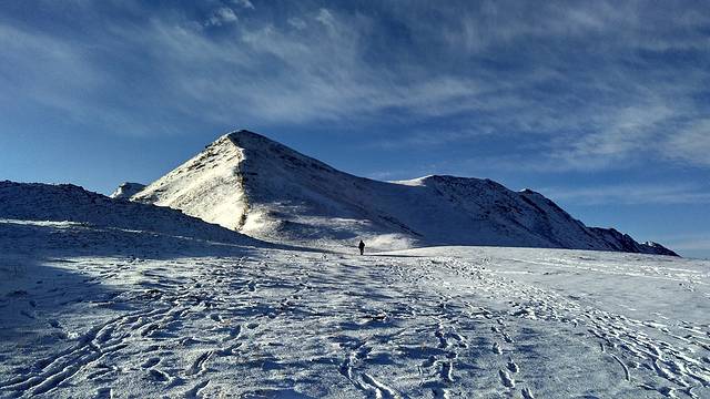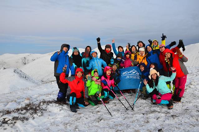 裹好保暖装备,穿上雪套、冰爪,带上手电,挎起单反,顶着寒冷,6点过天色渐亮,待路稍微看得清了,愿意去山顶等日出的不怕折腾的一队伙伴们便出发冲顶了。