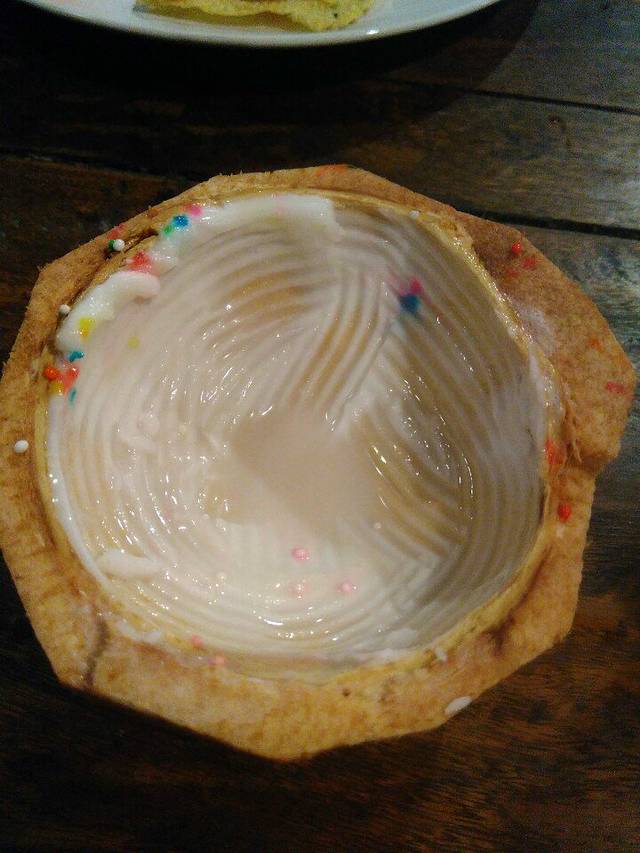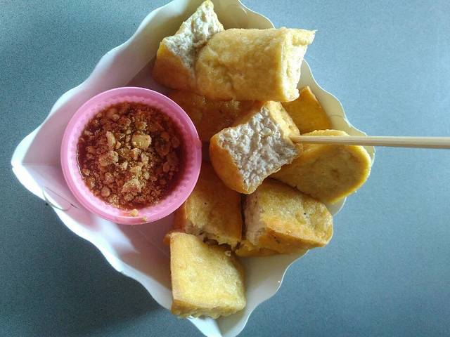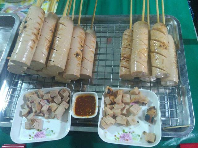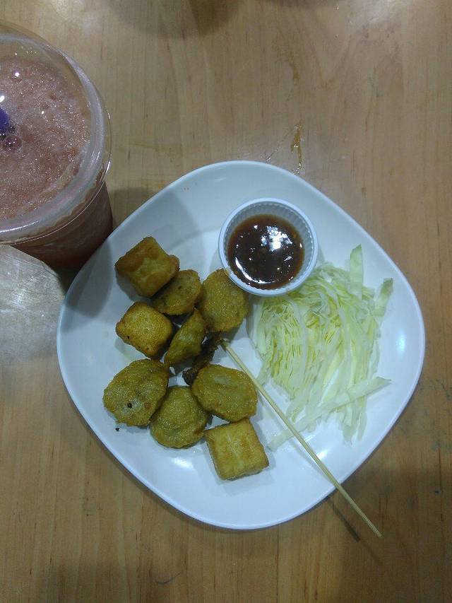 旧日风情街上的小吃。豆腐泡,但比国内的要饱满。口感好。20B.