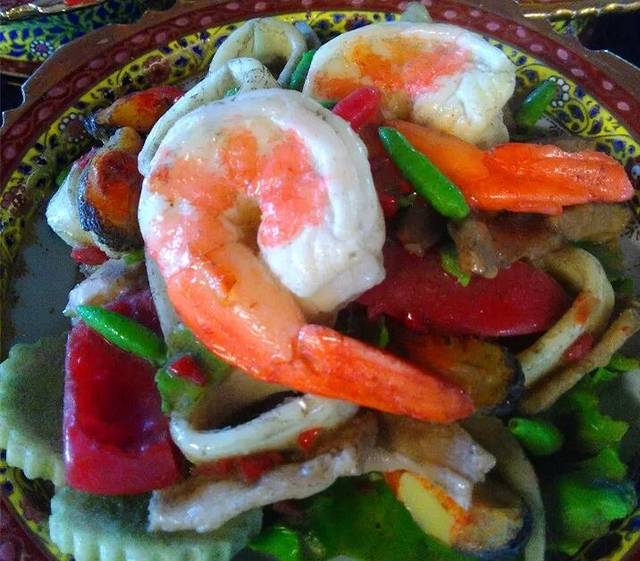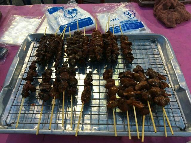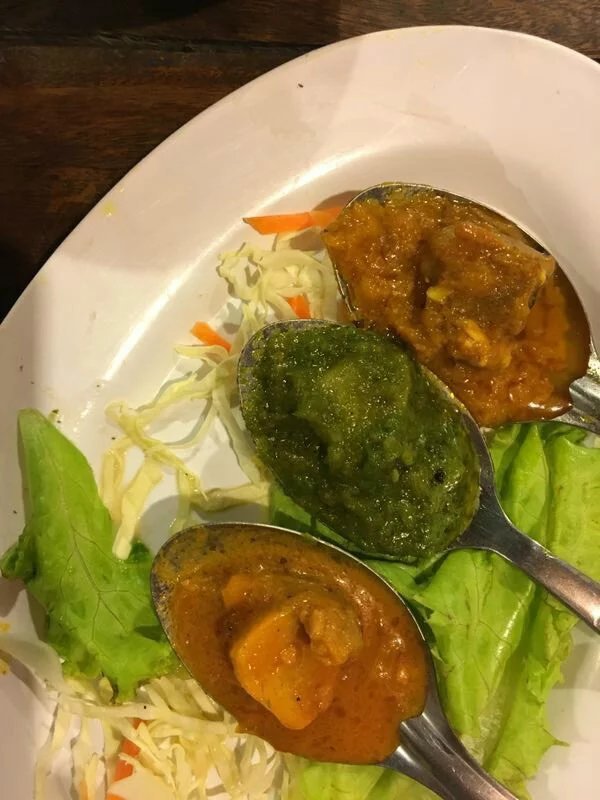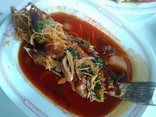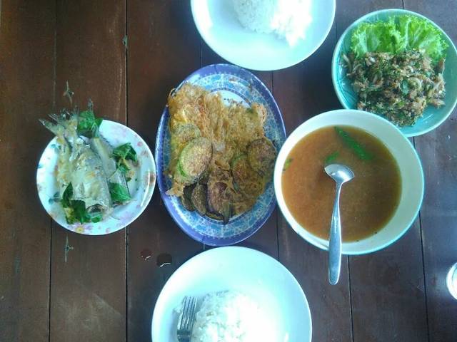 华欣的第一顿饭,他家只有鱼。右上角是拌的鱼肉,挺好吃;中间类似于茄盒;另外一个汤微辣,很下饭;另一个小鱼不入味,不喜欢。180B.