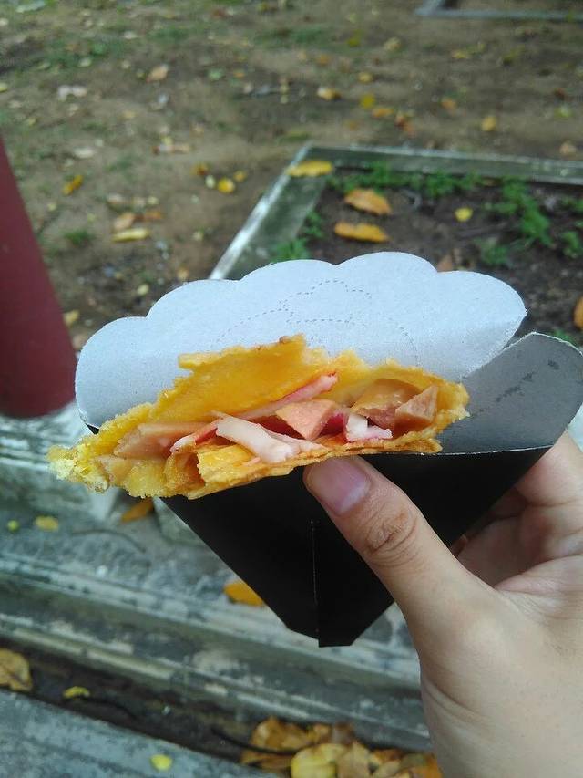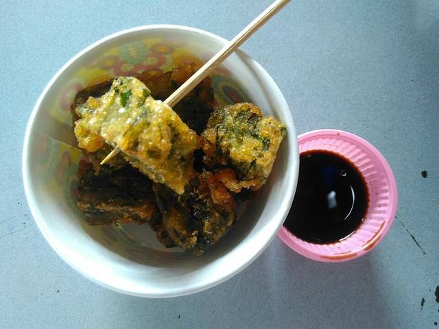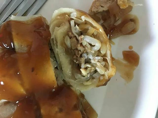 旧日风情街上的小吃。绿色的是韭菜。这个很好吃,有香味,又没有韭菜的冲味儿。30B.