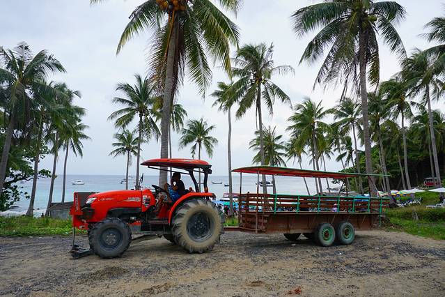 浮潜回来后,坐上这酷炫的拖拉机,到另一面的海滩去吃饭。