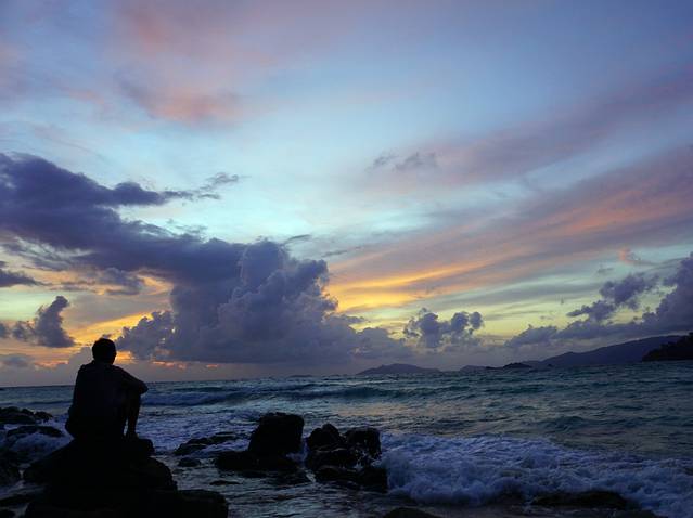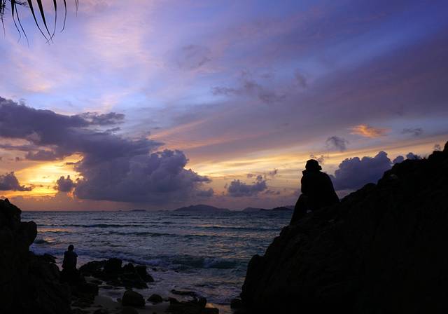 一起看日落的人,一人一块石头,听着海浪的声音,静静的等着红霞满天。