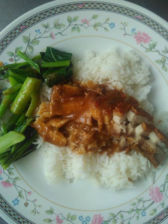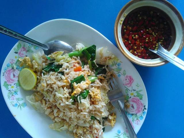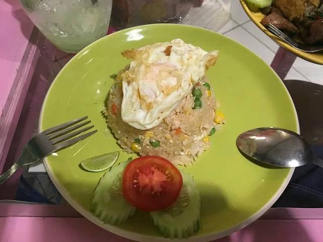 路边摊的炒饭。和国内的蛋炒饭味道一样,只不过加了空心菜。60B.
