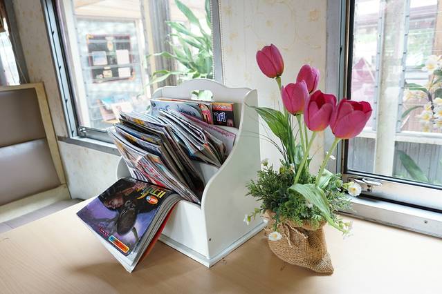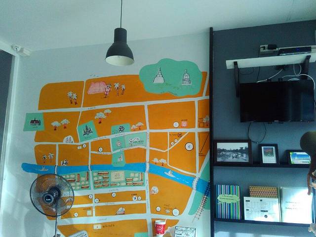 前台的墙绘地图,他家有旅游的景点相册,可以翻看。