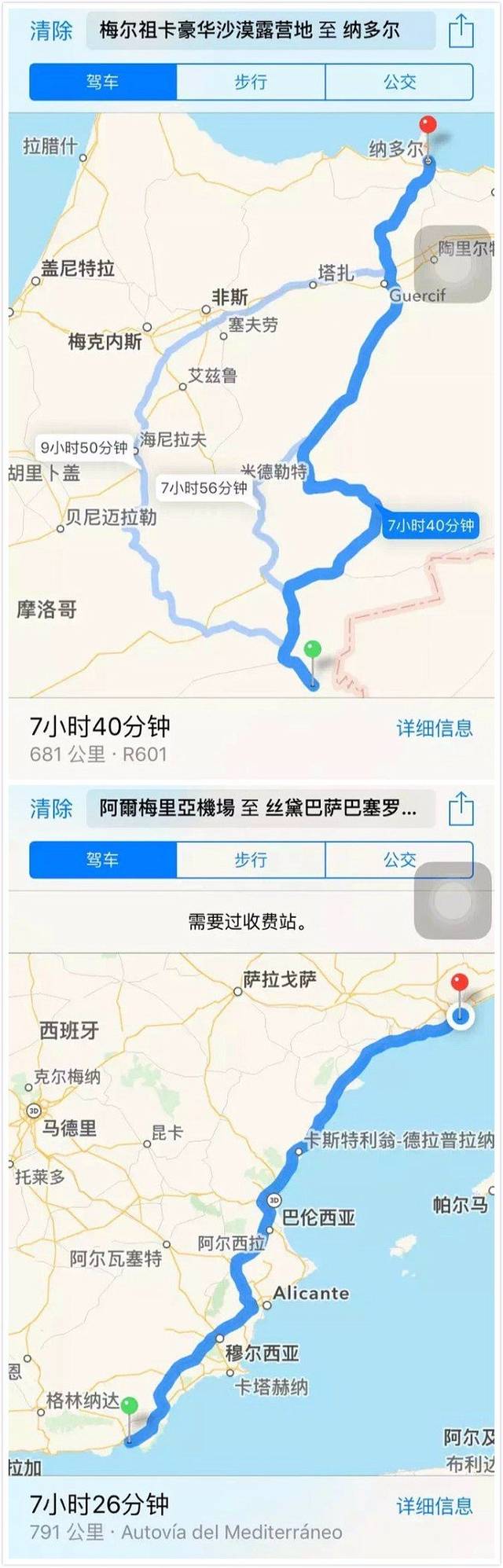 导航 是自驾出行的重中之重,除了租租车随车租借的gps导航仪,我们同时也开着Google导航,有时出现两个导航线路不同的情况,譬如在摩洛哥的某晚,Google直接把我们导进了一条没有路灯的土路,如此情况发生过几次,总结下来Google导航的路线或许距离更短,但有时那路根本没(不)办(给)法(人)开啊,不是土路就是旁支小道,不知是说它智能还是不智能?建议大家发现导航结果不一致时,路边停车开双闪,研究清楚再启程为好。