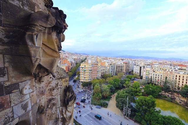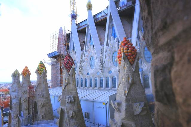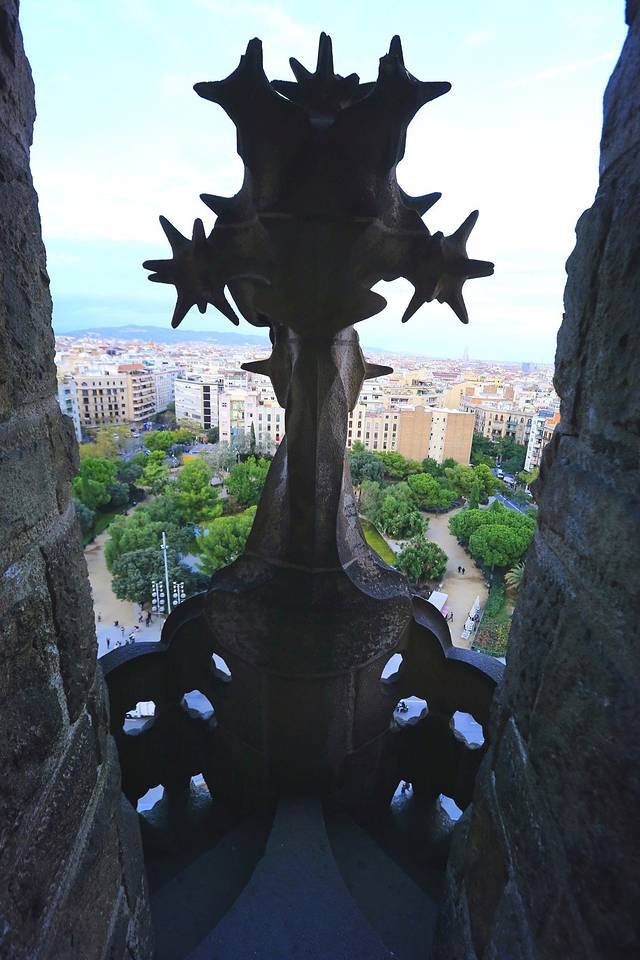 参观圣家堂建议网上预订门票,因为预订的人都在排队入场。我们9点半赶到圣家堂只剩下当天下午5点半最后一批的场次还有票,门票有几种类型可选,我们选择了登旧塔-看新塔,事后想想不太明智,因为新塔正在施工中,看出去的只是一根根脚手架啊之类的,而高迪所建经典旧塔却被踩在我们脚下。