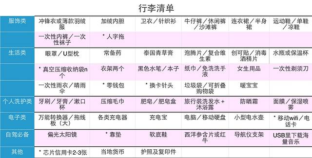 我列了个表格,是这次23天旅行从零度到40度以及自驾相关的装备清单:
