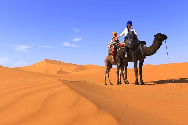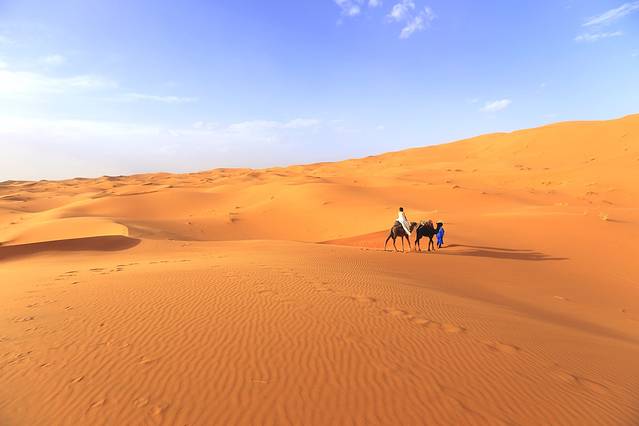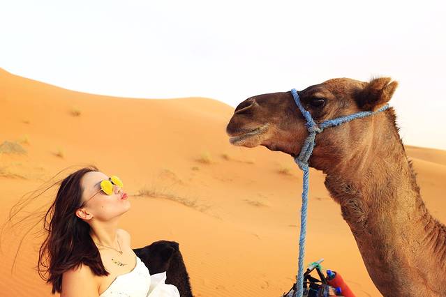 撒哈拉的沙漠之旅绝对是我旅行经历中难忘的一章。那个从文字中读到的撒哈拉,终于被踩在了脚下。金色细腻的沙子,扬起来却深深刺痛脸颊;当地人把帅哥称为阿里巴巴,也真有很多个名叫穆罕默德的缠着白色头巾的男人露出迷之微笑;沙漠里有驴、马、羊和沙狐,骆驼成了最常见的动物,它们真的很萌,长长的睫毛与大眼睛无比可爱。