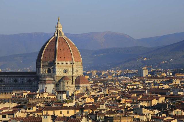 次日一早,攀上长长的台阶,从米开朗琪罗广场俯瞰晨光中的佛罗伦萨,这才看清它如此拥挤,一片淡黄色的建筑群里圣母百花既显眼又低调。它完美融入城市里,老桥横跨河水,与其遥相凝望。