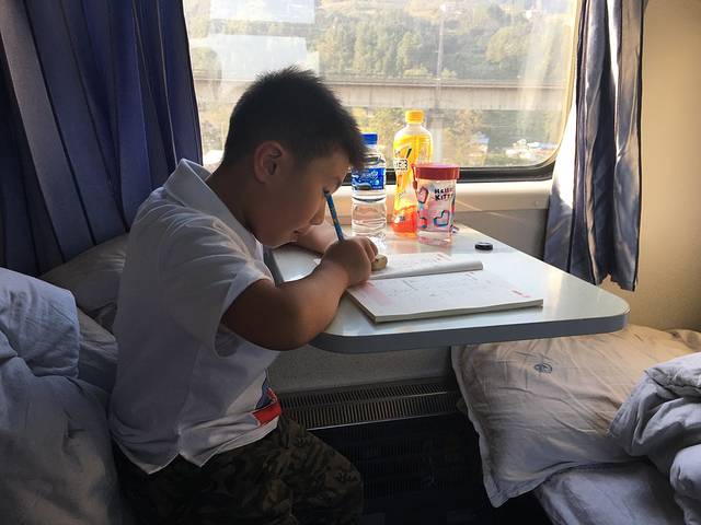 从镇远到安顺,五个小时火车,猴儿高兴地吃过他最喜欢的火车上的盒饭,拿出他在贵阳买的教辅资料安静地做了起来。