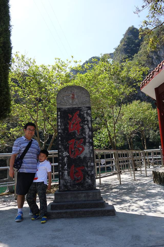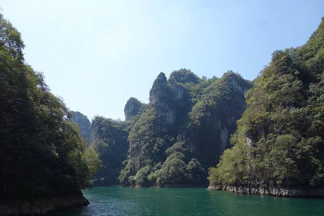 一下火车,寄存好行李,二话不说,包下一辆出租车直奔舞阳河。从景区大门进去,穿过一片小树林,走过一方危岩下,豁然开朗。舞阳河的绿水就在脚边,静静的乌篷船就在水里,天门洞的景致就在眼前。上船,开始舞阳河之旅。船在水中滑动,人在画中穿行,水波摇弋,清风拂面,暖日浴人。火烧赤壁、坐井观天、一线天、三叠水,一幅一幅的风景画在眼前掠过。孔雀开屏,舞阳河的标志性景观就在眼前。船停片刻,相机、手机,咔嚓咔嚓的声音不绝于耳,人人都生怕漏掉了这样一幅天人的作品。回来路上,不再拍照,只想这样静静地倘佯在这青山碧水、清风暖阳之中。