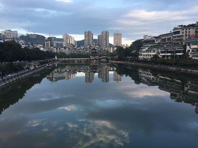 游罢舞阳河,直奔镇远古城,找到猴儿口中的天水谣客线(栈),放下行李,小憩片刻,便开始在古镇中穿行。走近舞水边,清,还是清。望向石屏山,静,还是静。过了新大桥,不再走那喧嚣的闹市,一头扎进镇远的小巷。从仁寿巷进去,踏着青石板,拾级而上。小巷人不多,两侧都是砖房、木房,商铺只是偶见,饭铺、银铺、酒铺。踢踏踢踏,一匹马驮着一些生活用品从这石板路上走过,也许,这才是真正的和谐吧。在古巷的上下穿行中,找了一家老字号袁记嫩豆花,开始晚餐,豆花、甜酒、飘香的鸡丝面、金黄的蛋炒饭,坐得闲情,吃得舒心。吃过晚饭,从四方井巷下山,走到石屏山下、祝圣桥头,找一块河边的青石护栏安静地坐下来,开始等待镇远的夜色。七点,华灯初上,有青山、有舞水、有古巷、有华灯、有微风、有音乐、有孤星、有明月……就缺一叶扁舟、一壶浊酒,不然也可以象东坡先生那样“肴核既尽,杯盘狼藉,相与枕藉乎舟中,不知东方之既白”了。