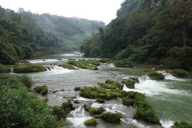 第一站,天星桥景区,可能是比较早的缘故,人还不算太多。刚进天星桥景区,一直走到天星湖,都觉得风景不过尔尔,走过天星桥,眼前突然一亮,美景尽在眼前。先有冒水潭瀑布,再有银链坠潭瀑布,特别是银链坠潭瀑布,实在是太美太形象了。水从远处流来,碰撞到一块块的孤石上,分成一粒粒的银白色的水链,这一粒粒水链又在石上跳跃着、歌唱着落入深潭。“嘈嘈切切错杂弹,大珠小珠落玉盘”,也不过如此吧。