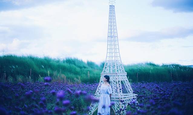 一大片淡雅的薰衣草,一些文艺的道具,破败的公交车,日系的铁塔……