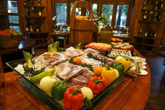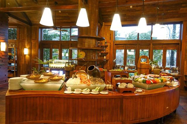 办理了入住,前台会推荐我们订西餐厅的自助餐。对了,前面提到的,有的是包括了早餐和泰餐厅的火锅的,我们没有选这个套餐。后来发现,泰餐厅也是非常漂亮的,后面也上图。我们在酒店前台团了3个人的半自助晚餐,198元/人。其实,来六善之前,我是团好了六善下午茶的,188元。但是,工作人员告诉我,晚餐分量很多,建议换个时间用下午茶。想着我们一行3人,上午11点就可以去,我们就用双人早餐+下午茶当我们3个人的早餐啦,嘿嘿!