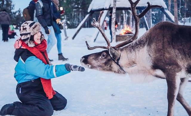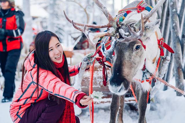 圣诞村里除了有圣诞老人,还有他的好朋友驯鹿们。在圣诞老人村有专门的驯鹿体验园区,在里面可以去跟雪白的驯鹿照相,体验乘坐驯鹿雪橇,园区门口还有升起的篝火让你坐着暖暖身子。