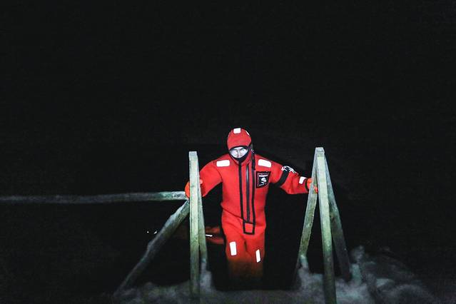 他们用一台机器放在湖里制造水波,使得湖边的一个区域不会结冰。然后我们穿上特制的橡胶连体服去湖里躺着。这种红色连体服据说以前用于冰湖或者北冰洋的搜救,在乘坐破冰船,下到北冰洋漂浮体验穿的也是同一款衣服。这种衣服由厚橡胶制成,隔热并且浮力很大,里面就正常穿着我们自己的羽绒服外套什么的就可以。