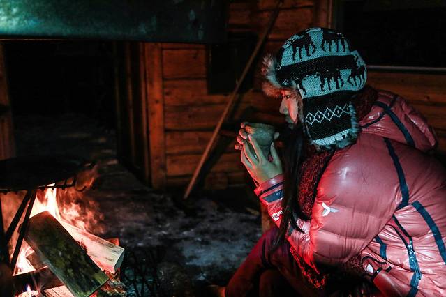 首先在约定时间到旅行社报道,他们会带上一些防寒的装备,还有芬兰圣诞季节必备的热蓝莓汁和姜饼。然后开车带我们前往远离市区,半小时车程外的森林中。那里有一些独家木屋可供租来玩,夏天来森林游湖玩耍的人很多,冬天因为湖面结冰也冷,就没什么人来。