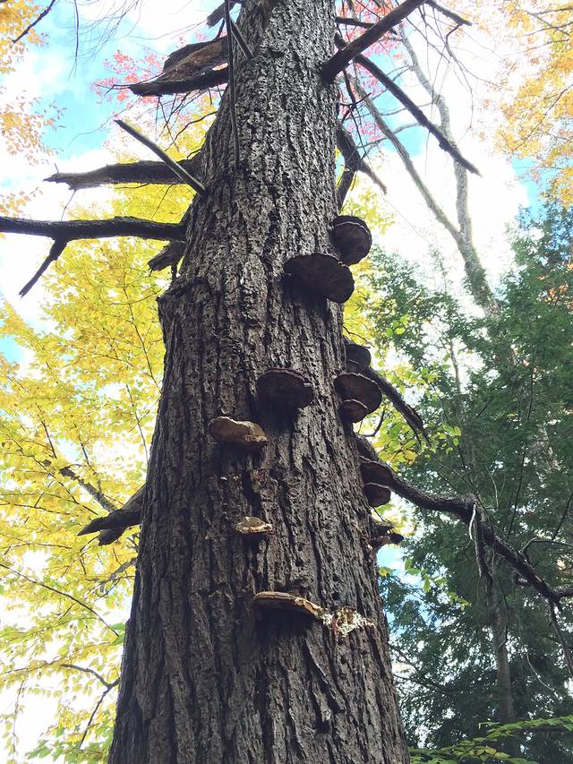 有好几棵树上都长着这种貌似灵芝的东西,我们用树枝戳下来几个,长得很大,也不知道是不是灵芝,摸上去硬硬的。