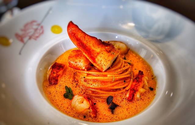主餐,龙虾意大利面,法餐的特色就是口味浓郁,量少,摆盘精致。这气泡带着酒味,汤味很浓郁,大虾脚的肉质Q弹