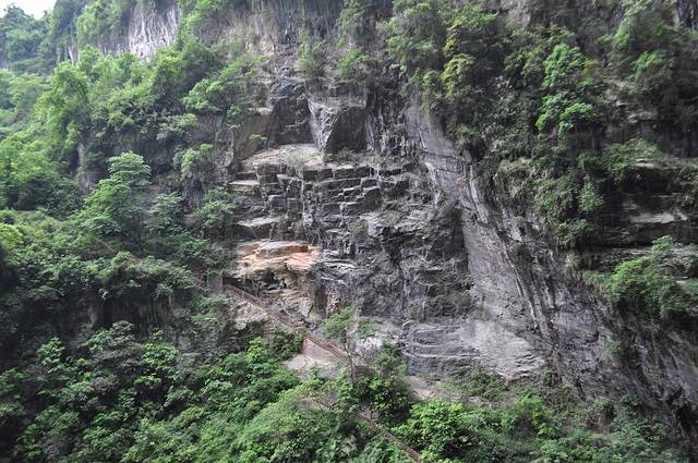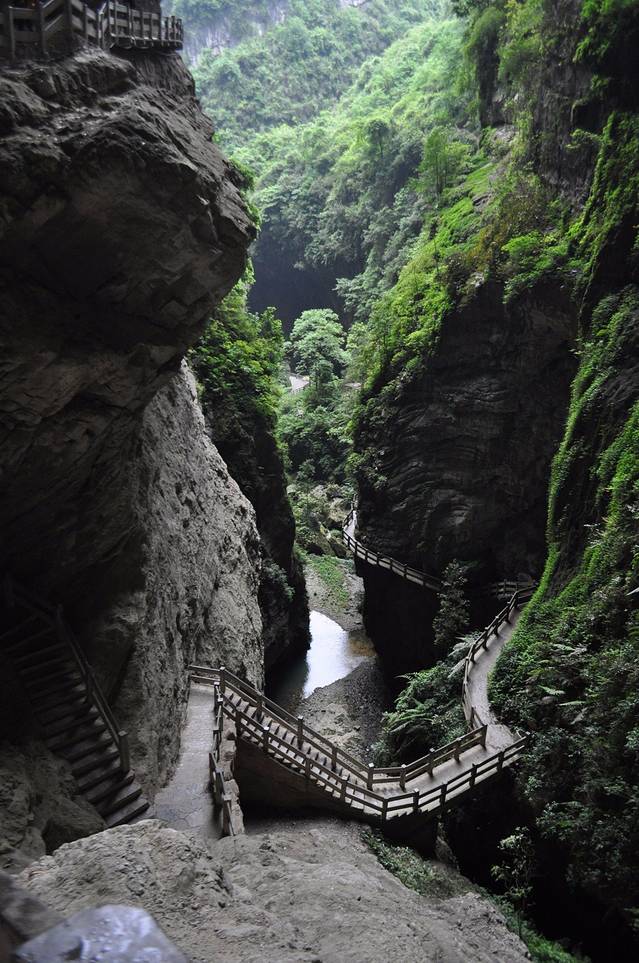 到了天生三桥要坐电梯下去,然后在走楼梯到最底部。楼梯就是图上这样的,有一些陡,而且楼梯上拍照的人很多,一定要拿好东西,小心一点走路。