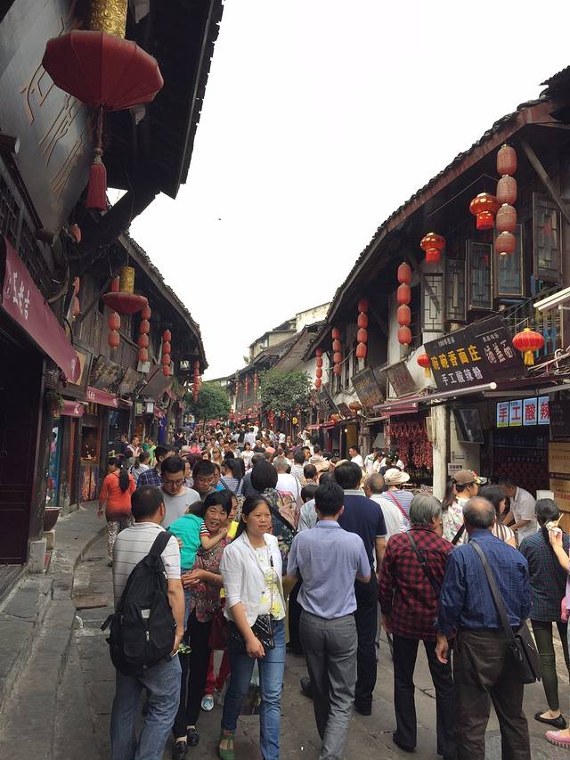 磁器口古镇就是一条美食街,有一整条街的好吃的,简直挑花了眼。几乎每一家店铺都是卖吃的的,有酸辣粉,豆腐花,烤串儿,钵钵鸡,陈家麻花,糍粑,凉糕,鸡杂。。。。。