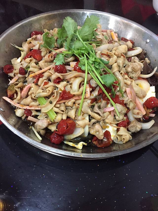 由于午饭乱七八糟的吃了很多,晚上大概九点才吃的饭。在住处附近找了一家鸡杂店,是属于那种很小的小店,类似于兰州拉面那样的,装修的也很简陋,但是吃干锅很有气氛。跟其他的干过一样,混了很多配菜,煮的久一点非常入味。鸡杂就是鸡肠,鸡胗这一类的内脏,最好再配上木薯,藕,土豆,芹菜,有荤有素吃起来比较带感,不然有点太油的。吃的时候一定要点米饭,不然会太辣太油了。