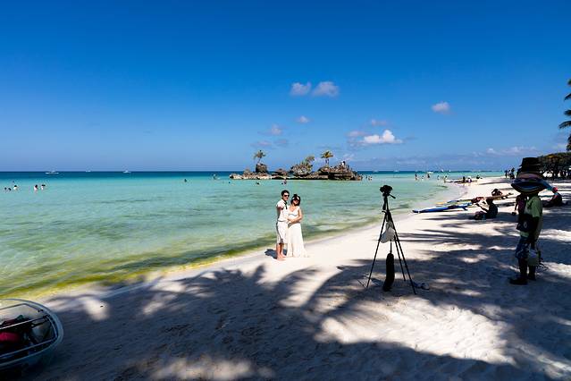 外国情侣用相机在定时自拍,单凭这一点就能说明长滩岛真的很漂亮了吧