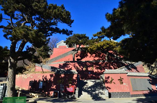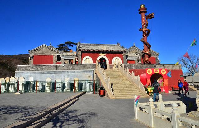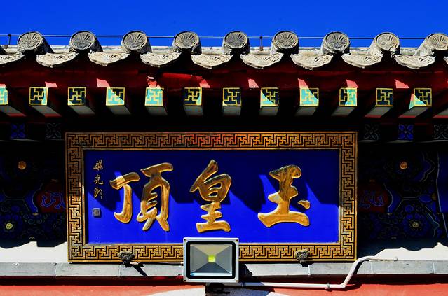 “玉皇顶是妙峰山景区的最后一组建筑,一座坐西北朝东南的小院,占地面积110平方米,三间正殿,供奉着玉皇大帝的神像,红墙灰瓦,高居山顶,游人登临此处,俯视下方的建筑群,颇有高高在上的神圣之感。”