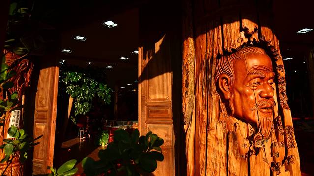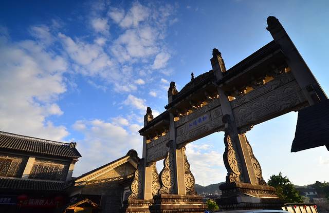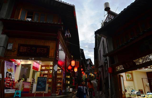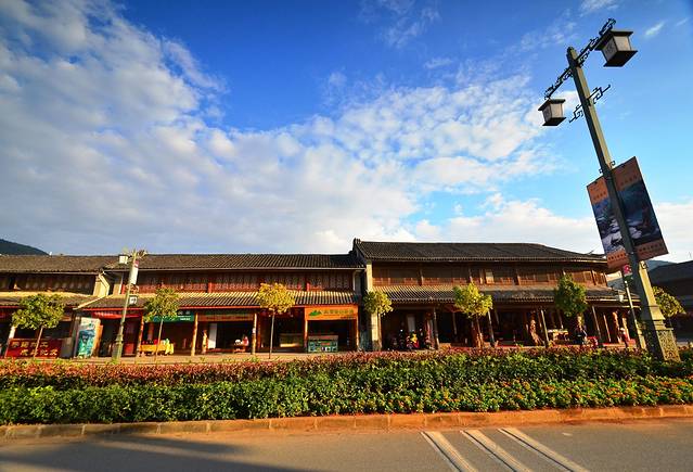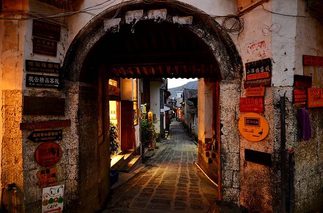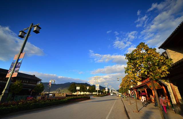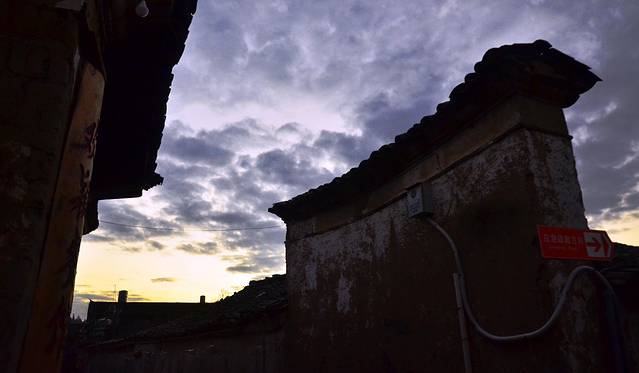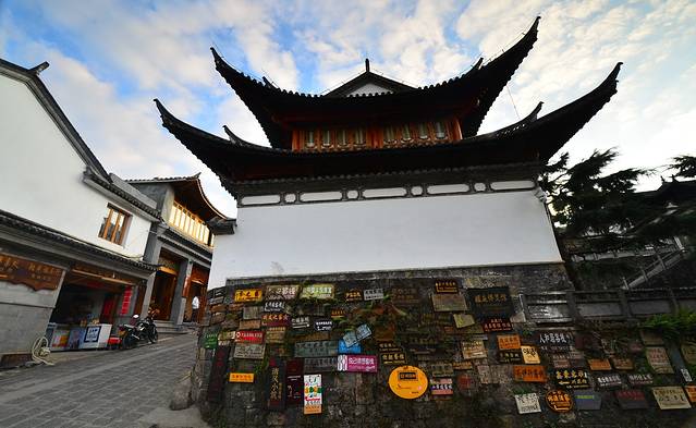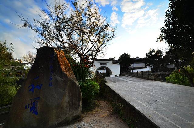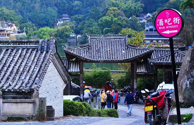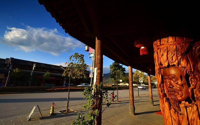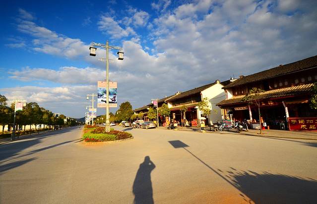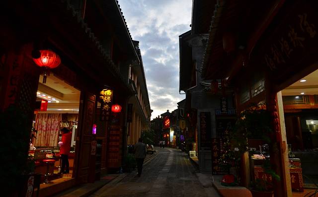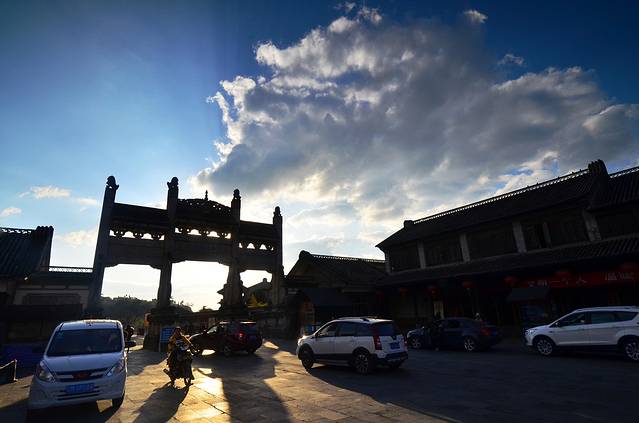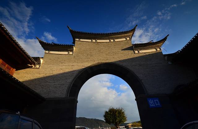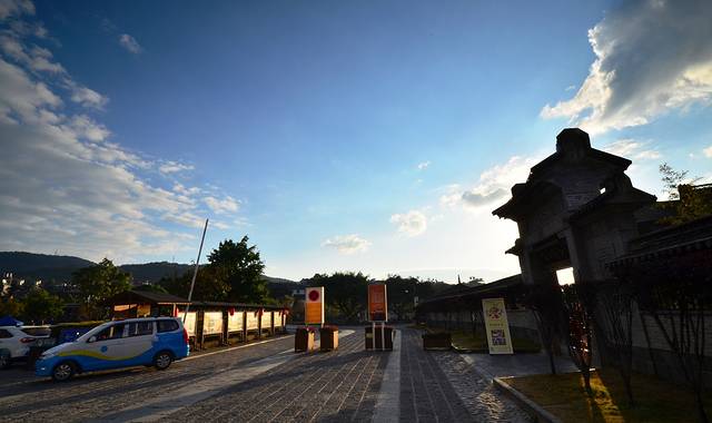 我下了公交是大约傍晚的5点多钟吧,光线很暖。西南边陲天黑的晚,要一直到晚7点多钟才会全黑。那会儿一个人走在冬日的暖阳下很惬意。霞光把大自然的一切都打上了金黄色,管你懂不懂摄影,那光线就在那里。古城入口处的大门牌楼在逆光下显得很雄伟,不过新修建的古镇虽显干净整洁但失却了少许的沧桑和历史感。