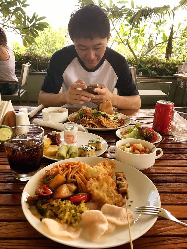 乌布皇宫出来以后,临时抱佛脚在网上找推荐的好吃的(也是来过这里的朋友推荐的),找到了有名的莲花餐厅。既然有名不预约是肯定不行✋🏻的,但是我和野哥来的早,就走运了,不仅有位置还给我俩,服务员还找了个观景很好的地方
