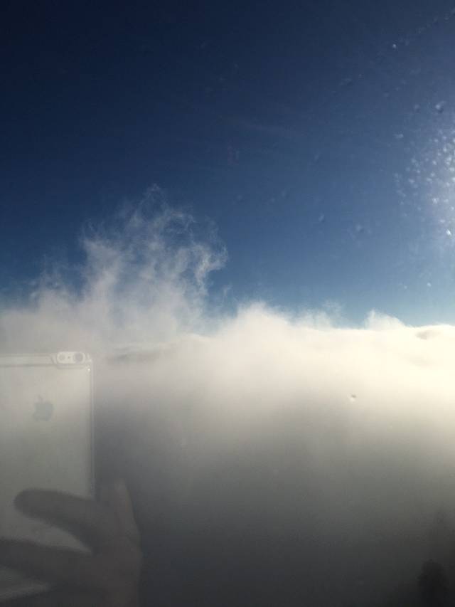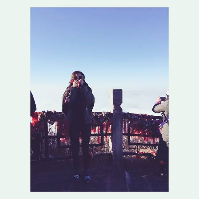 下车知道要风度是不行滴,-8度我要奔溃了,我买了防滑的套鞋袜,还有一丢丢防风效果哈哈哈哈,还好,我是年轻人,能忍,跟着人群走,一上台阶,美呆了.... 日出的光晕和眼前一片雪白,冻翻的小手拿出手机拍了几站,手机.....额,关机了........ IPHONE sucks