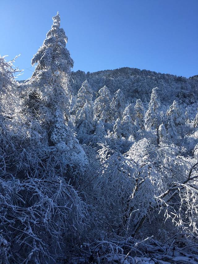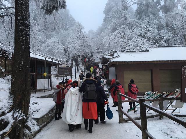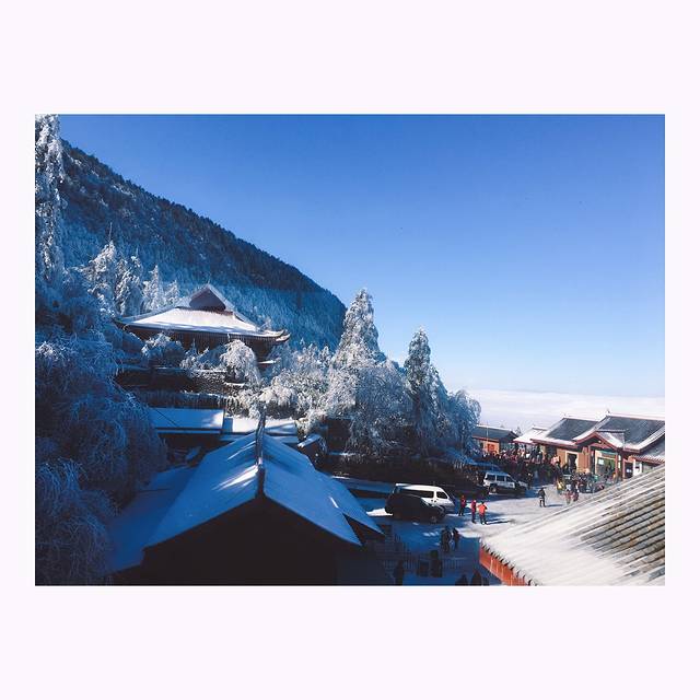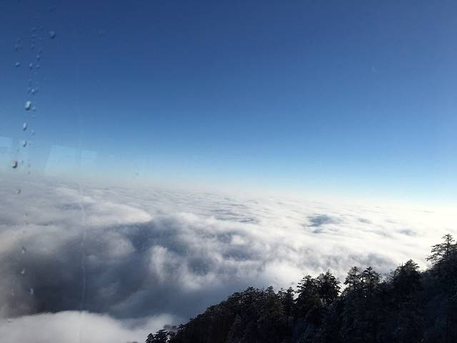 半小时路程到坐缆车的地方,多少票根忘记了,来回好像80,关键这个缆车等很久,很久很久... 还好坐上去的时候眼前风景足以让我忘却早上的种种不堪,了无遗憾啊..........很快就到金顶了,尝试着开机,迅速拍了几张,太美啦!!然后手机又关了...... 蔚蓝的天空,层层叠叠的云彩,初升起的太阳,还有树丛的雪泛着水珠,我真的陶醉在这四面八方的雪和仙境了