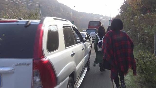 我无奈两次穿村儿找小路,还不错躲过了不知道几百辆车,最终在距离景区还有3公里的地方纹丝不动了。我感觉我的离合器都要糊了,干脆把车停在路边,给当地人20块钱后,背着摄影器材徒步前往景区。