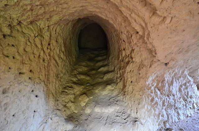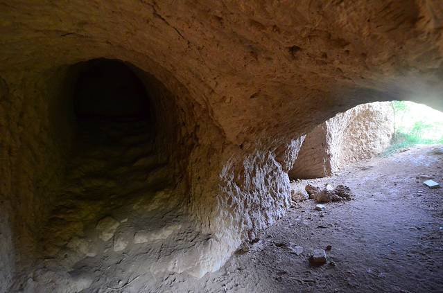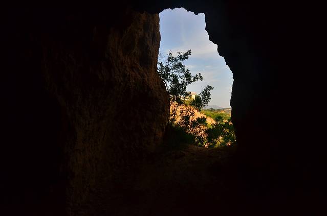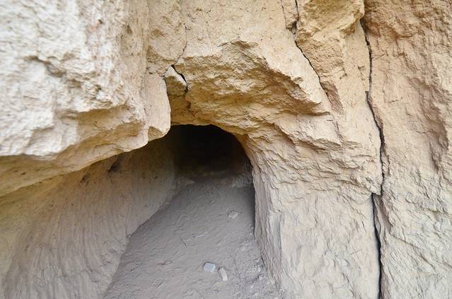 在我爬升到地面,准备离开“地坑院”的时候,看到了一个指示牌,写着“抗日洞”,令我兴趣陡升,顺着路牌就踱了进去,就是上图中的那些人工后搭建的假长城里,依旧是一人没有。我站在上面大致俯瞰了一下大好山河后,正准备悻悻离去时,竟在一个非常隐蔽的角落里发现了那个昔日的“抗日洞”!