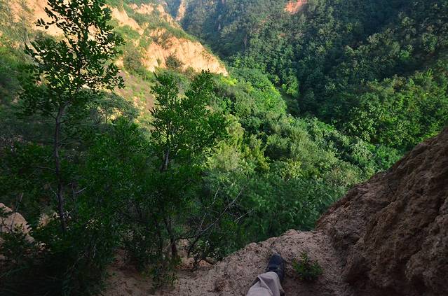 最后看到山洞的远处有亮光,应该离另一个出洞口不远了。有了光明,人就不害怕了。下到洞底,我不敢冒失,缓步地向最亮处走去。果然,幸亏我走的慢,如果要是跑动的话,一旦脚底站不住,从这个洞口直接就摔下万丈深渊了!