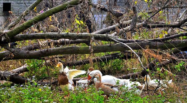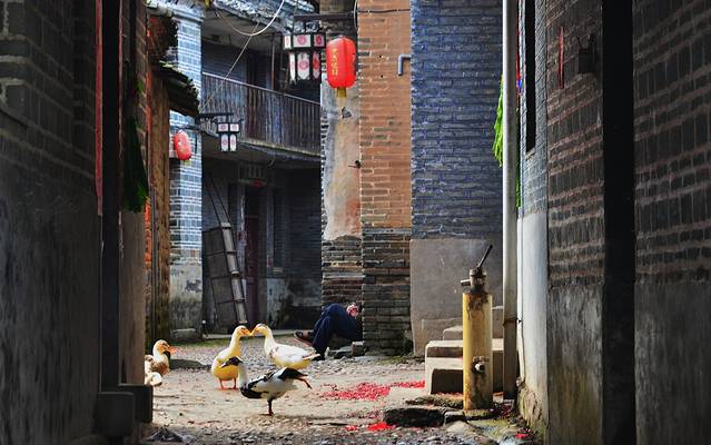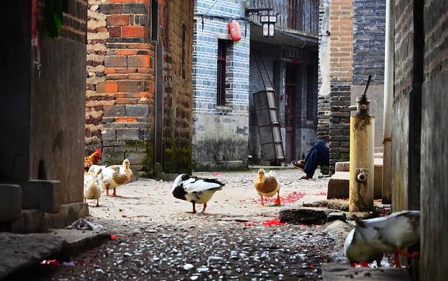 就在我专心致志地抓拍村子里的鸡鸭动物时,无意中发现远处的角落里有一只悠闲的人脚在轻轻摇荡。他一定不是为了显示自己的悠闲而悠闲,一定不是在装,因为他的视野里不会有旁观的人。也许也不全是悠闲,有消磨?有等待?
