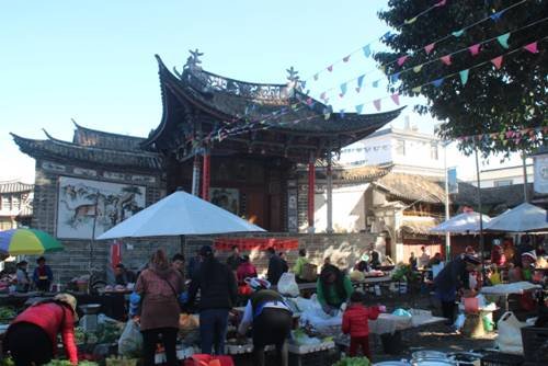 因为扎染而去,但是去了发现沿路就是一条商铺街零零散散几间扎染商店,所以我们直接开到农贸市场。农贸市场其实就是大戏台前古树下的一片空地,当地白族人就在这里摆地摊做买卖,不大,但是吃的用的都齐全。