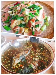 推荐的菜式:藤椒弓鱼(来到这里就建议不要再吃酸辣鱼了,试试藤椒吧,香香麻麻的真是打开新味觉啊!弓鱼是洱海特有的鱼,听说是只能野生的,肉质确实是比较紧实,鱼皮胶纸层比其它淡水鱼都厚,所以要尝尝!要尝尝!)豆尖豆腐汤(其实就是一个清滚素汤,但由于连日吃了都是味道较重油较重的白族菜,这个素汤简直就是仙汤,其它搭配的素汤也都很多人推荐的)火腿炒蒜苗(火腿据说是诺邓火腿,和平时吃的火腿不一样的是咸味略淡但是更有肉质的香味),除了这三个以外,听说牛肉是他们家招牌,可是真的吃不下了,还有包浆豆腐我也没有试过~你们谁吃了好吃的要告诉我,说不定我还去呢!?