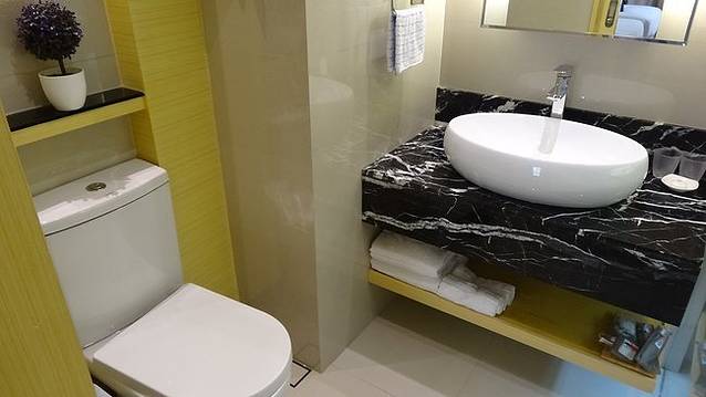 这是一家建于 2012 的经济型酒店,地理位置不错,毗邻地铁站和叮叮车站,交通出行方便,但房间狭小局促 —— 尤其是浴室卫生间,小到让人难以想象!