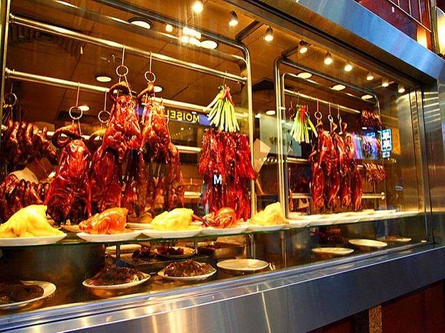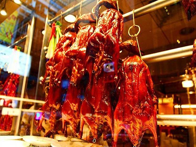 镛记一楼橱窗挂满烧鹅、烧腊、烧鸡,有如百货公司的橱窗柜一般,这一招实在是太强大了,烧鹅就这样跟个麻豆似的展现曼妙身材,光是路过久被这美景给吸引,看得我肚子好饿啊!