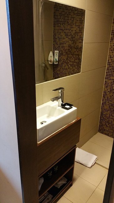 首先是房间 —— 特别是卫生间浴室实在太过狭小,洗澡几乎动作大一点就会撞到墙上,而且卫生间淋浴和马桶没有用玻璃完全干湿分离(即便他想隔开,也没地方隔),浴帘根本就无济于事,基本上每次洗完澡,卫生间都会 “ 水漫金山 ”。洗漱的面盆小到就像小朋友过家家的玩具一样,而且房间迷你到没有衣柜和椅子,想要挂件衣服都很困难。